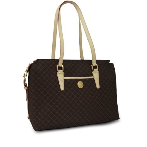 Throw all your goodies inside. A gentle dark gold RIONI monogram print on solid brown Italian canvas body accented with Italian dual strapped Leather.handles and trim. Embossed gold RIONI Moda Italia emblem. Front pouch pocket. Rear zipper pocket. Zipper opening entrance. Goldenrod fabric RIONI monogram print lining. Interior cell phone pouch, pocket pouch and a zipper pocket. Also included is a detachable zipper pouch wallet.Hand-crafted meticulously by expert leather craftsmen, Rioni uses natural cow hide leathers. The leather gains character by enrichening the color over time. Sunlight exposure and the oils from hands intensify the process. Each design is tested for durability so that you may enjoy your piece for years to come. TrendToGo brings to you this Italian hand-made luxury. Measurement Units: Inch, Color: Brown, Brand: Rioni, Gender: Women's, Material: Leather, Bag Type: Totes Brand: Rioni, Width: 6, Height: 11, Length: 17